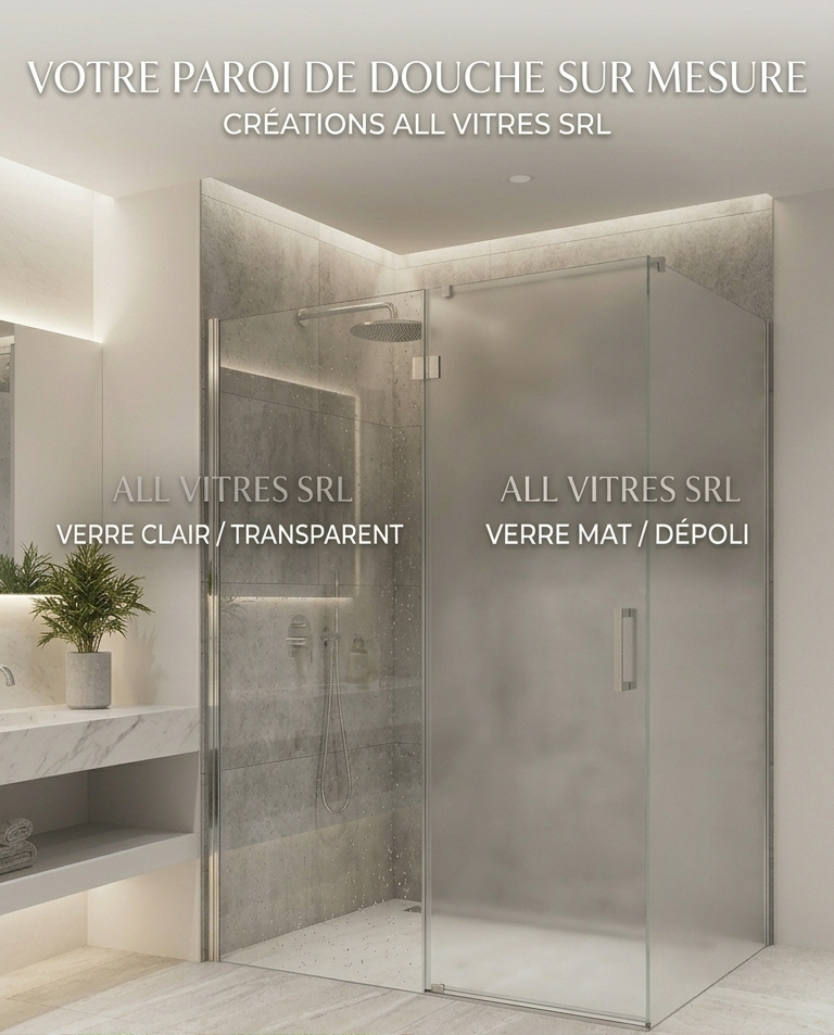 Chez All Vitres SRL, nous proposons l'ensemble de ces types de verre avec façonnage sur mesure : rodage des bords, perçage pour fixations et charnières, découpes spéciales, pour répondre aux exigences de chaque projet de douche.